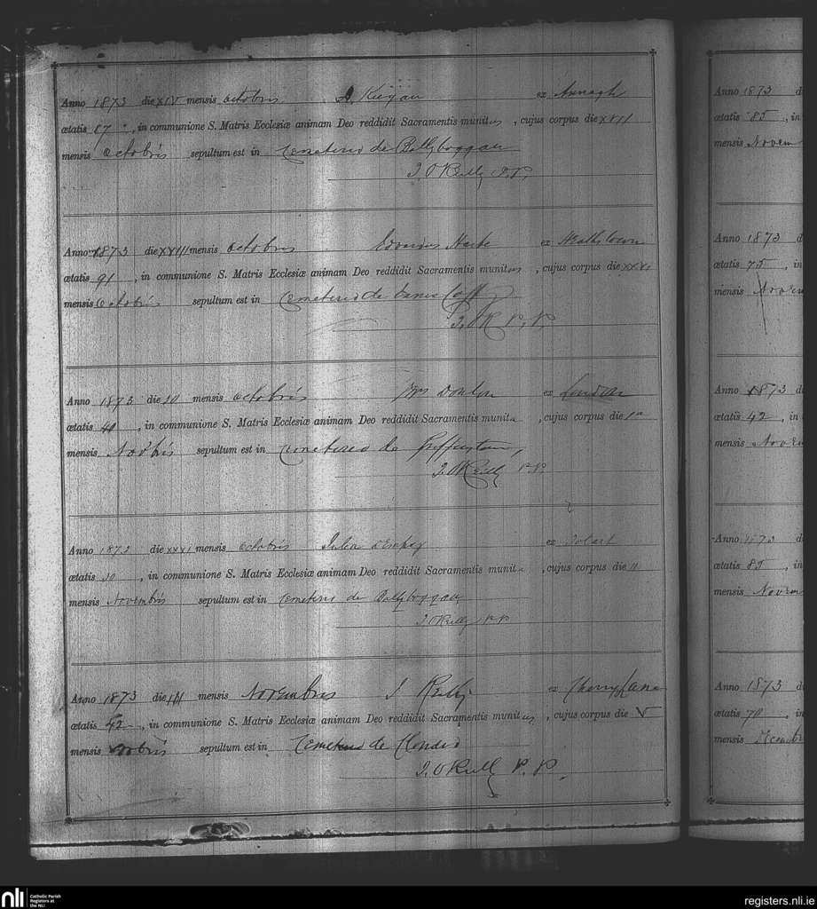 Kinnegad; County of Westmeath; Diocese of Meath. Deaths, Oct. 1873 to Nov. 1873