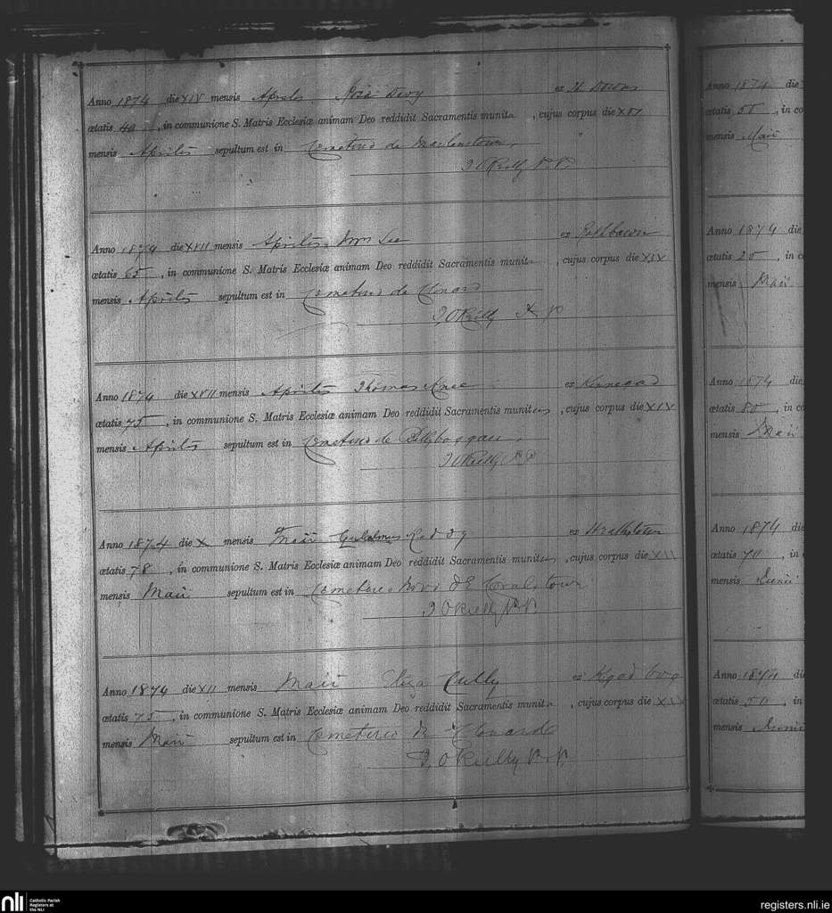 Kinnegad; County of Westmeath; Diocese of Meath. Deaths, Apr. 1874 to May 1874