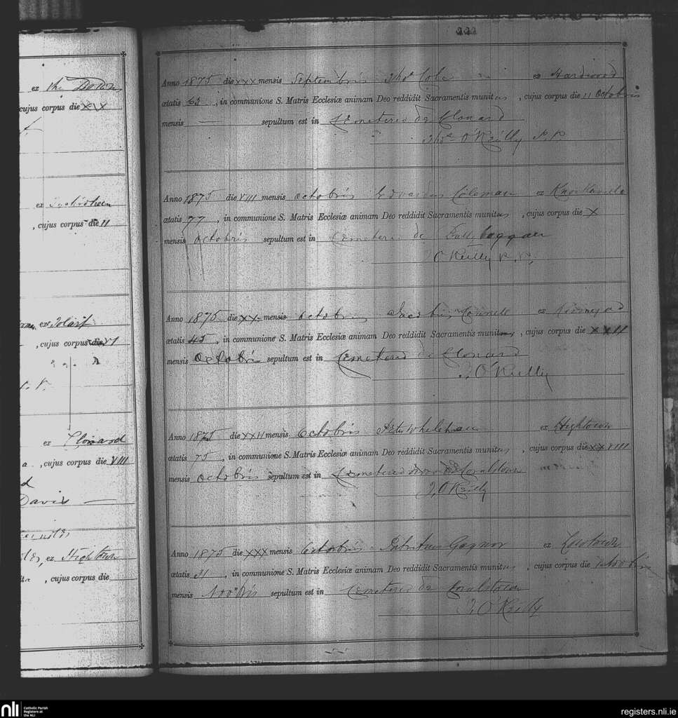 Kinnegad; County of Westmeath; Diocese of Meath. Deaths, Sep. 1875 to Oct. 1875