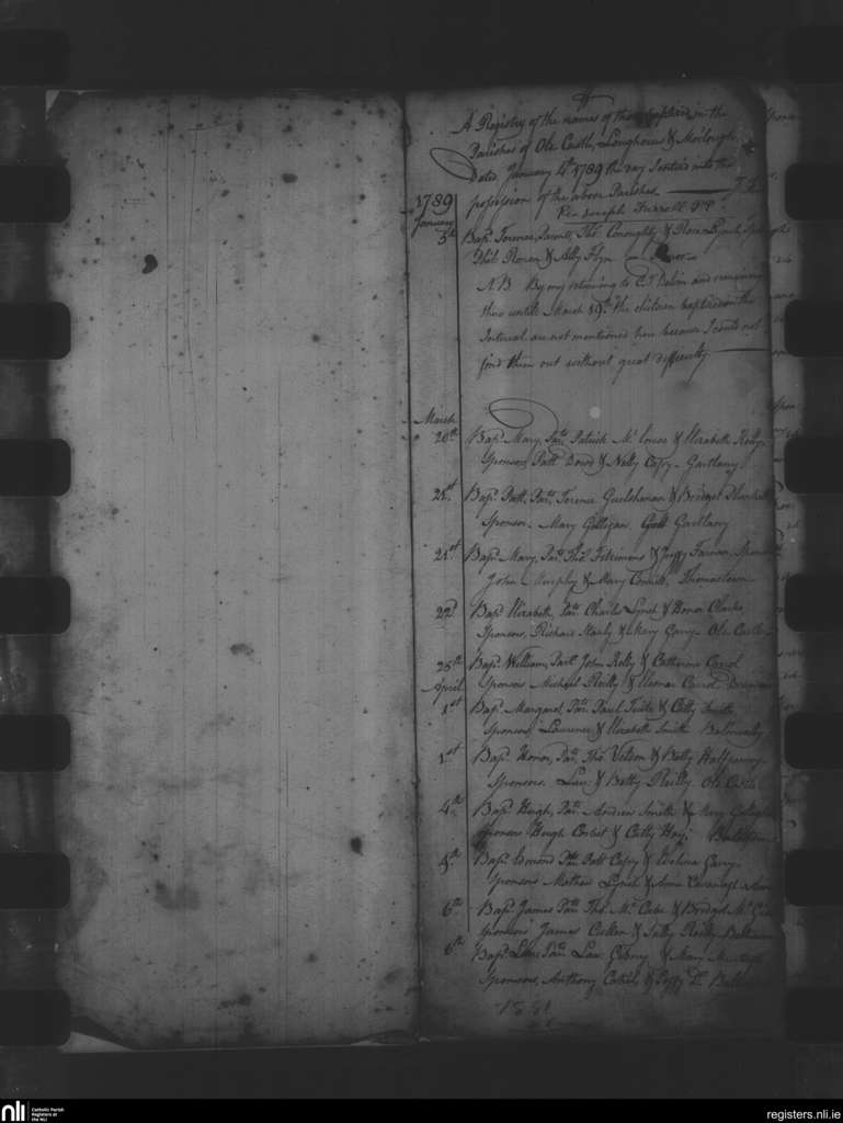 Oldcastle; County of Meath; Diocese of Meath. Baptisms, Jan. 1789 to Apr. 1789