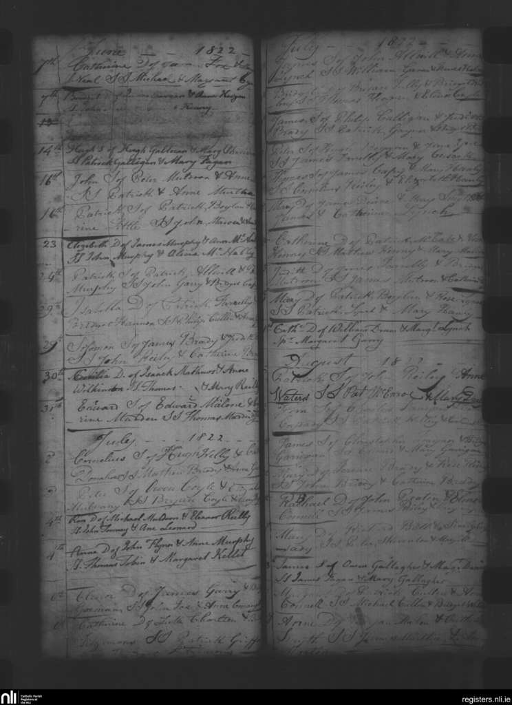 Oldcastle; County of Meath; Diocese of Meath. Baptisms, June 1822 to Aug. 1822