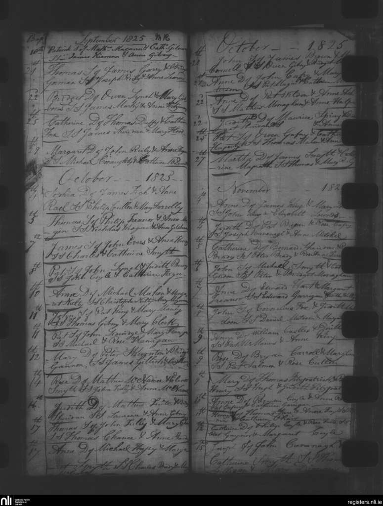Oldcastle; County of Meath; Diocese of Meath. Baptisms, Sep. 1825 to Nov. 1825