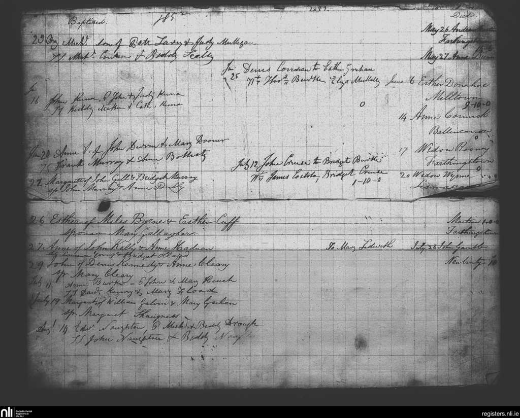 Milltown; County of Westmeath; Diocese of Meath. Baptisms, Marriages, Deaths, Feb. 1852 to Aug. 1852