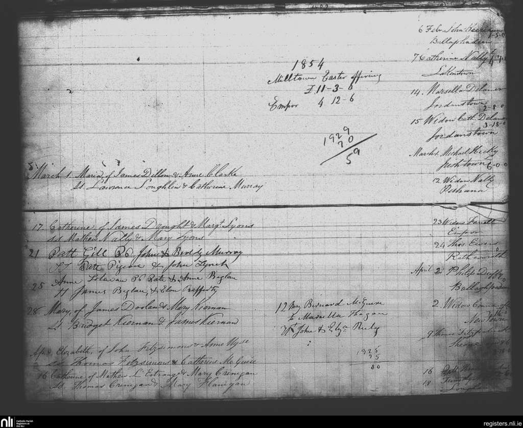 Milltown; County of Westmeath; Diocese of Meath. Baptisms, Marriages, Deaths, Feb. 1854 to May 1854