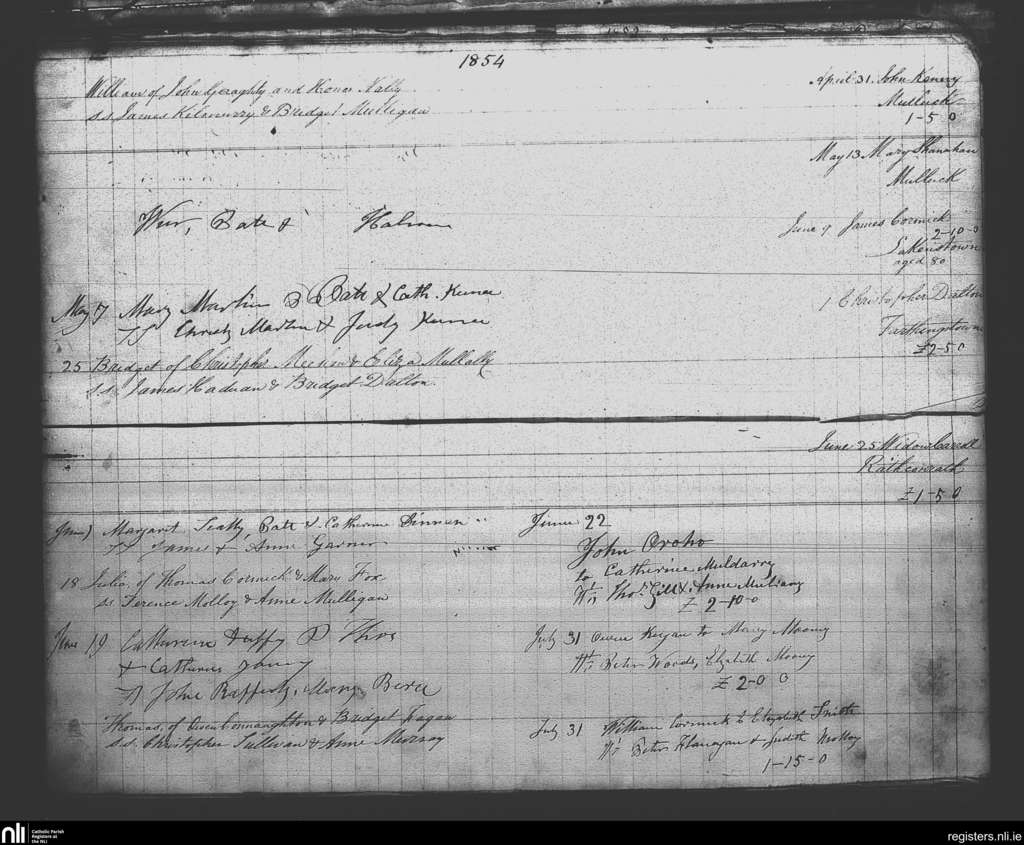 Milltown; County of Westmeath; Diocese of Meath. Baptisms, Marriages, Deaths, Apr. 1854 to July 1854