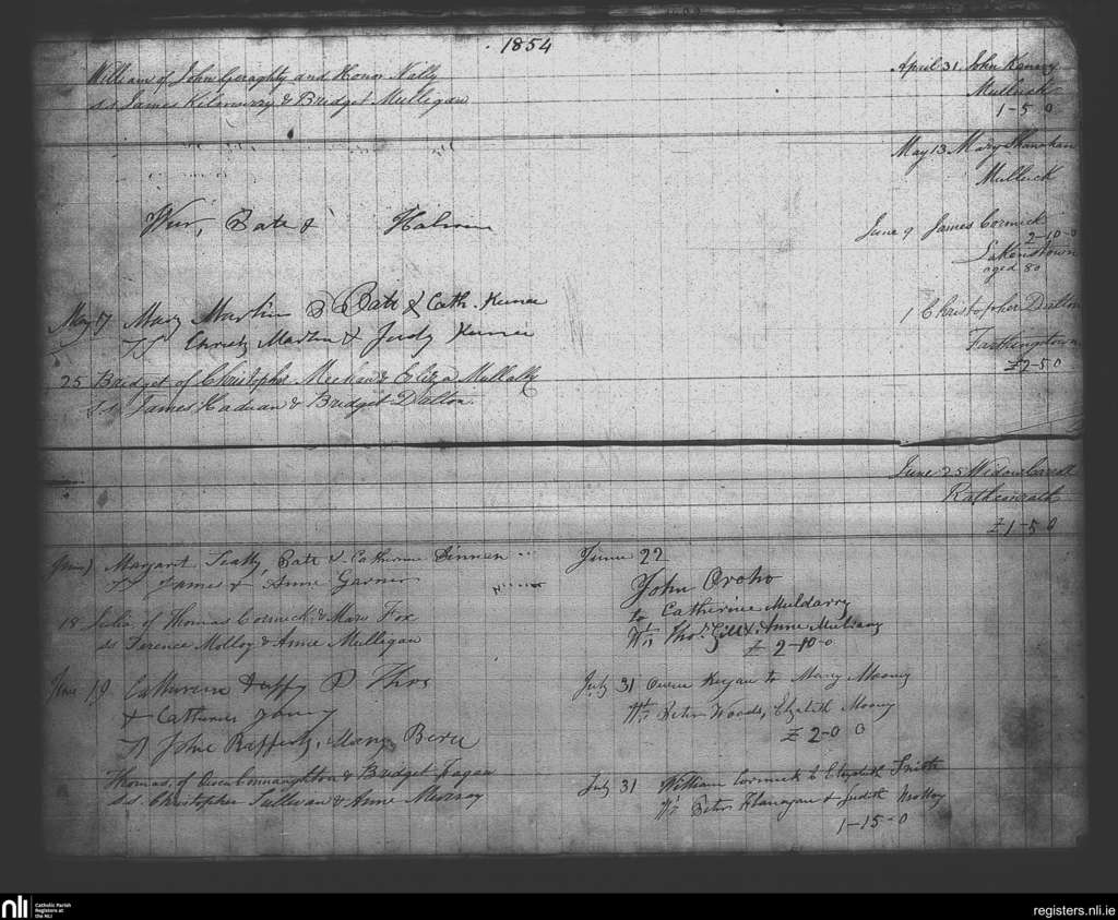 Milltown; County of Westmeath; Diocese of Meath. Baptisms, Marriages, Deaths, Apr. 1854 to July 1854