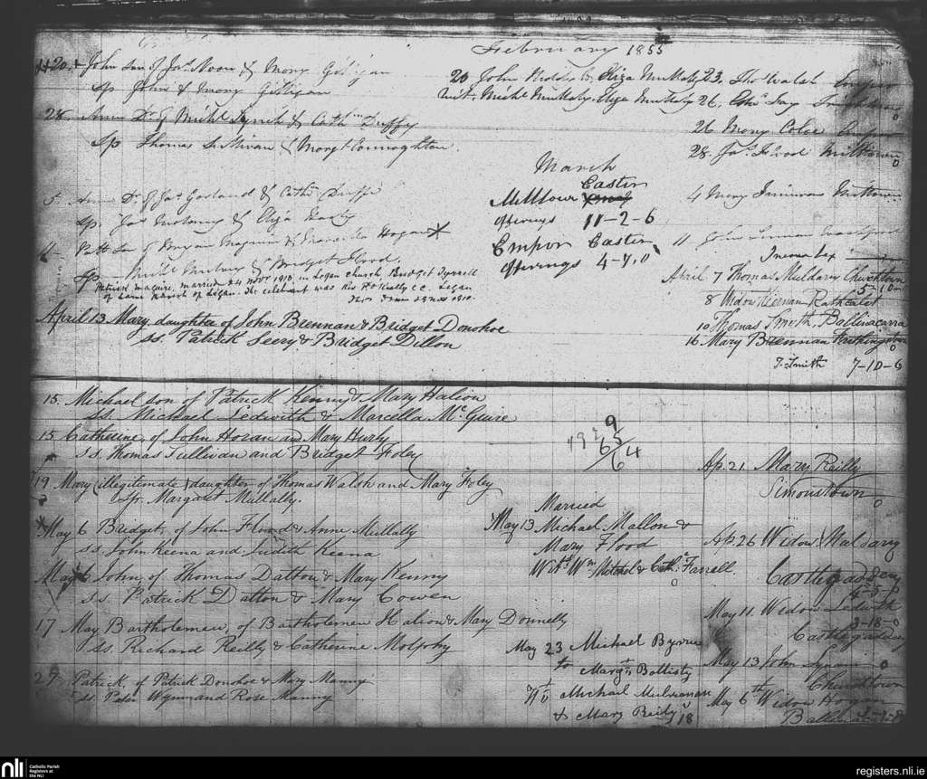 Milltown; County of Westmeath; Diocese of Meath. Baptisms, Marriages, Deaths, Feb. 1855 to May 1855