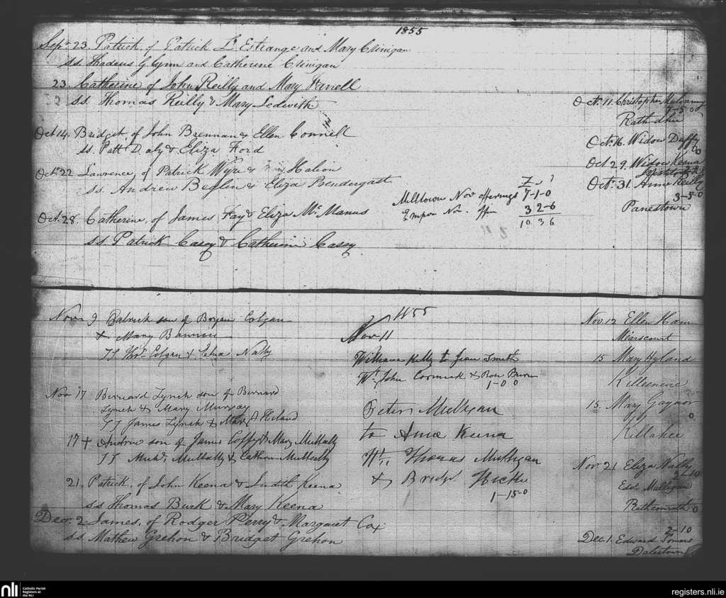 Milltown; County of Westmeath; Diocese of Meath. Baptisms, Marriages, Deaths, Sep. 1855 to Dec. 1855