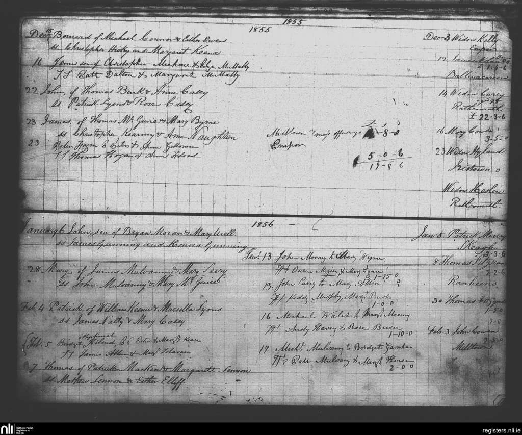 Milltown; County of Westmeath; Diocese of Meath. Baptisms, Marriages, Deaths, Dec. 1855 to Feb. 1856