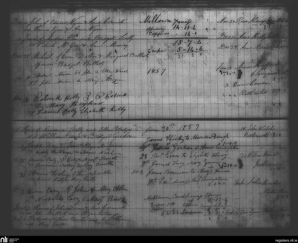 Milltown; County of Westmeath; Diocese of Meath. Baptisms, Marriages, Deaths, Nov. 1856 to Feb. 1857