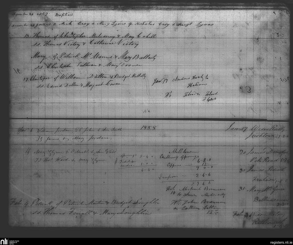 Milltown; County of Westmeath; Diocese of Meath. Baptisms, Marriages, Deaths, Dec. 1857 to Feb. 1858