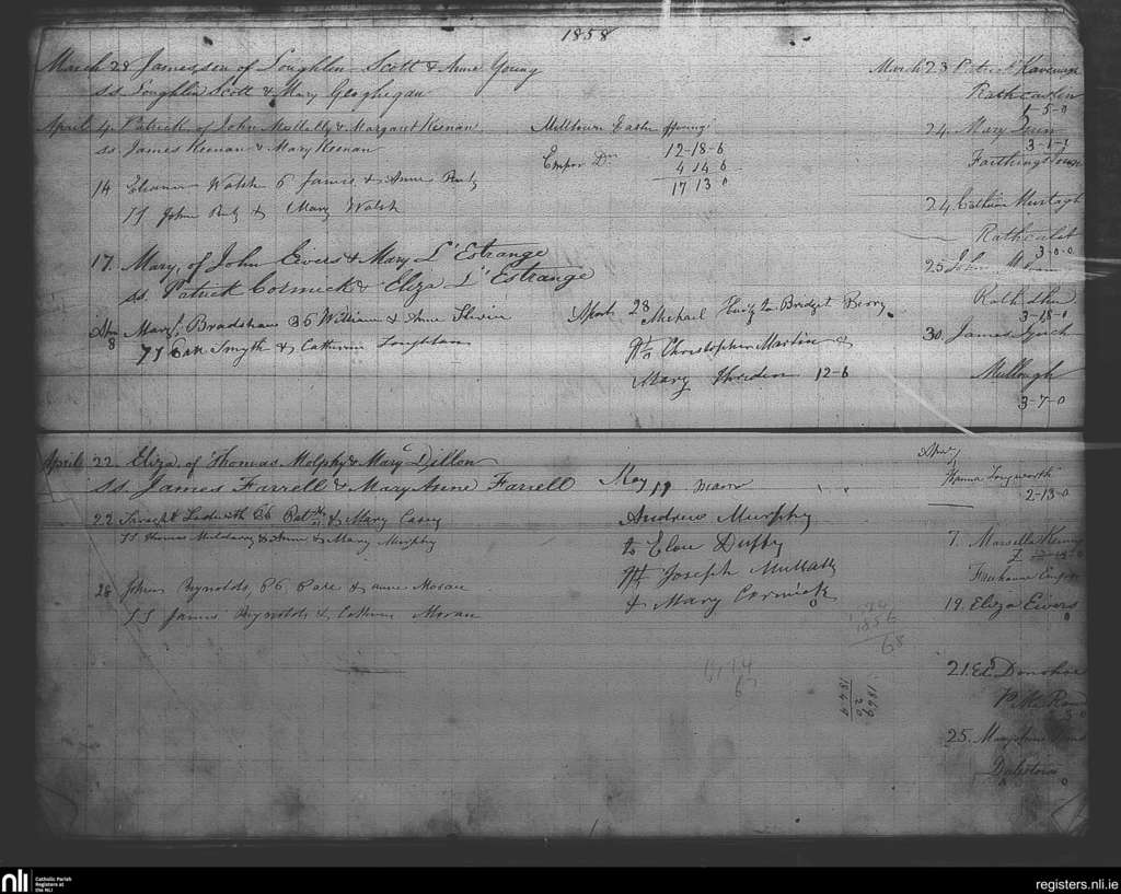 Milltown; County of Westmeath; Diocese of Meath. Baptisms, Marriages, Deaths, Mar. 1858 to May 1858