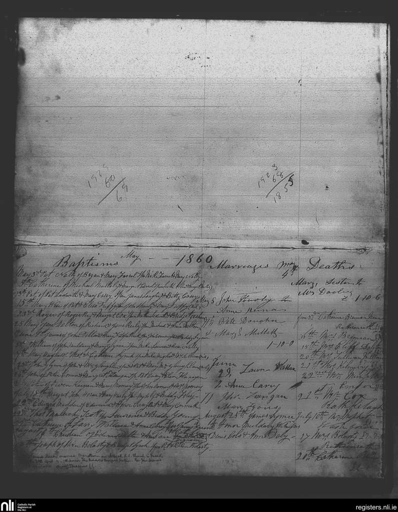 Milltown; County of Westmeath; Diocese of Meath. Baptisms, Marriages, Deaths, May 1860 to Aug. 1860