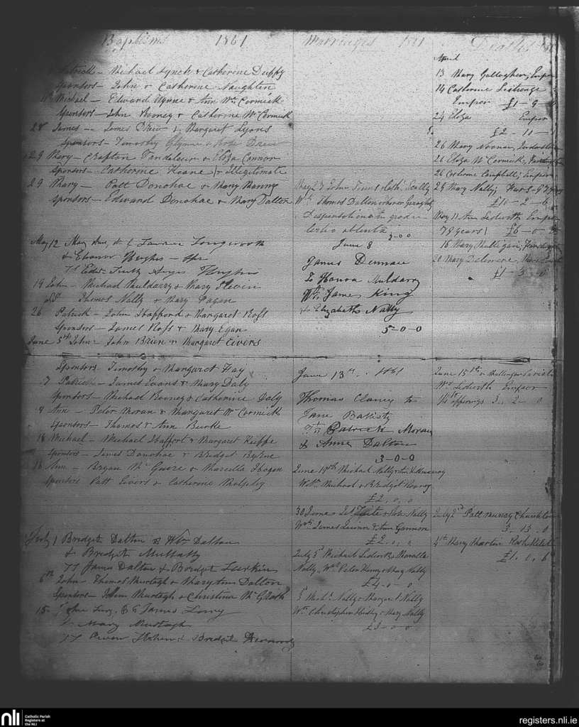 Milltown; County of Westmeath; Diocese of Meath. Baptisms, Marriages, Deaths, Apr. 1861 to July 1861