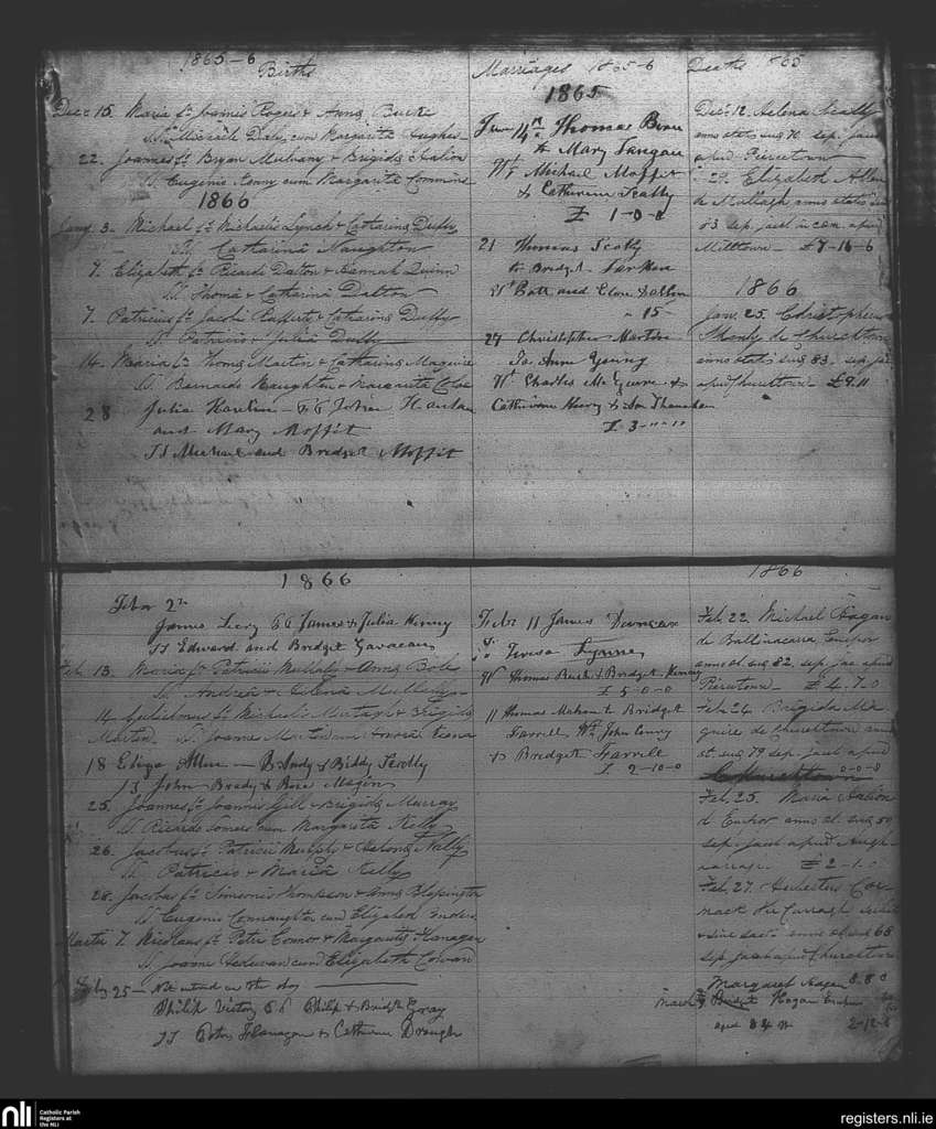 Milltown; County of Westmeath; Diocese of Meath. Baptisms, Marriages, Deaths, Dec. 1865 to Mar. 1866