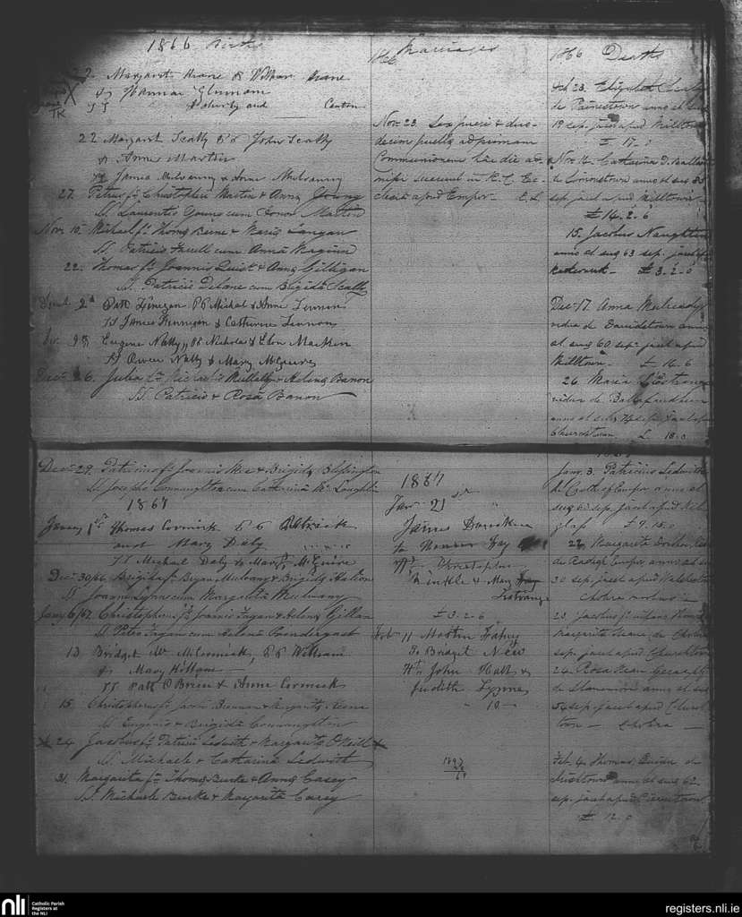 Milltown; County of Westmeath; Diocese of Meath. Baptisms, Marriages, Deaths, Feb. 1866 to Feb. 1867