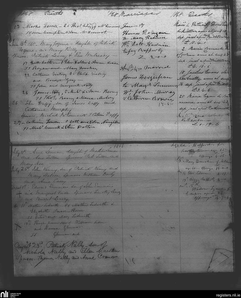 Milltown; County of Westmeath; Diocese of Meath. Baptisms, Marriages, Deaths, Mar. 1868 to Sep. 1868