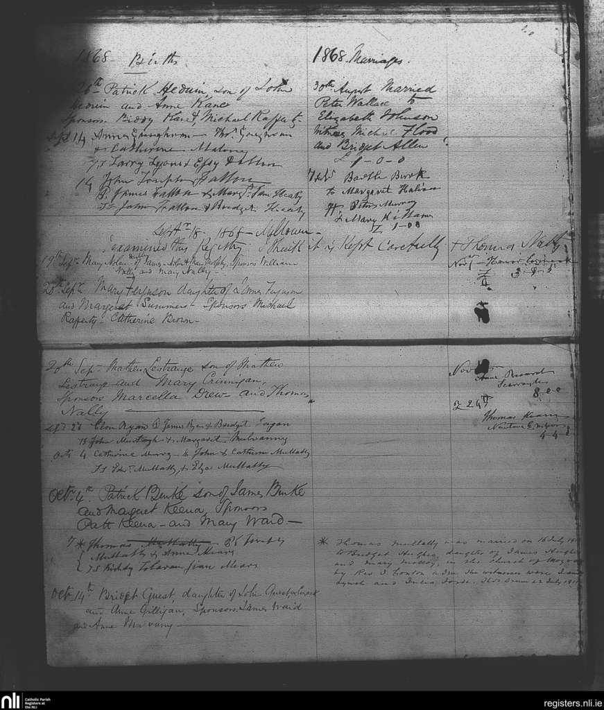 Milltown; County of Westmeath; Diocese of Meath. Baptisms, Marriages, Deaths, Aug. 1868 to Nov. 1868