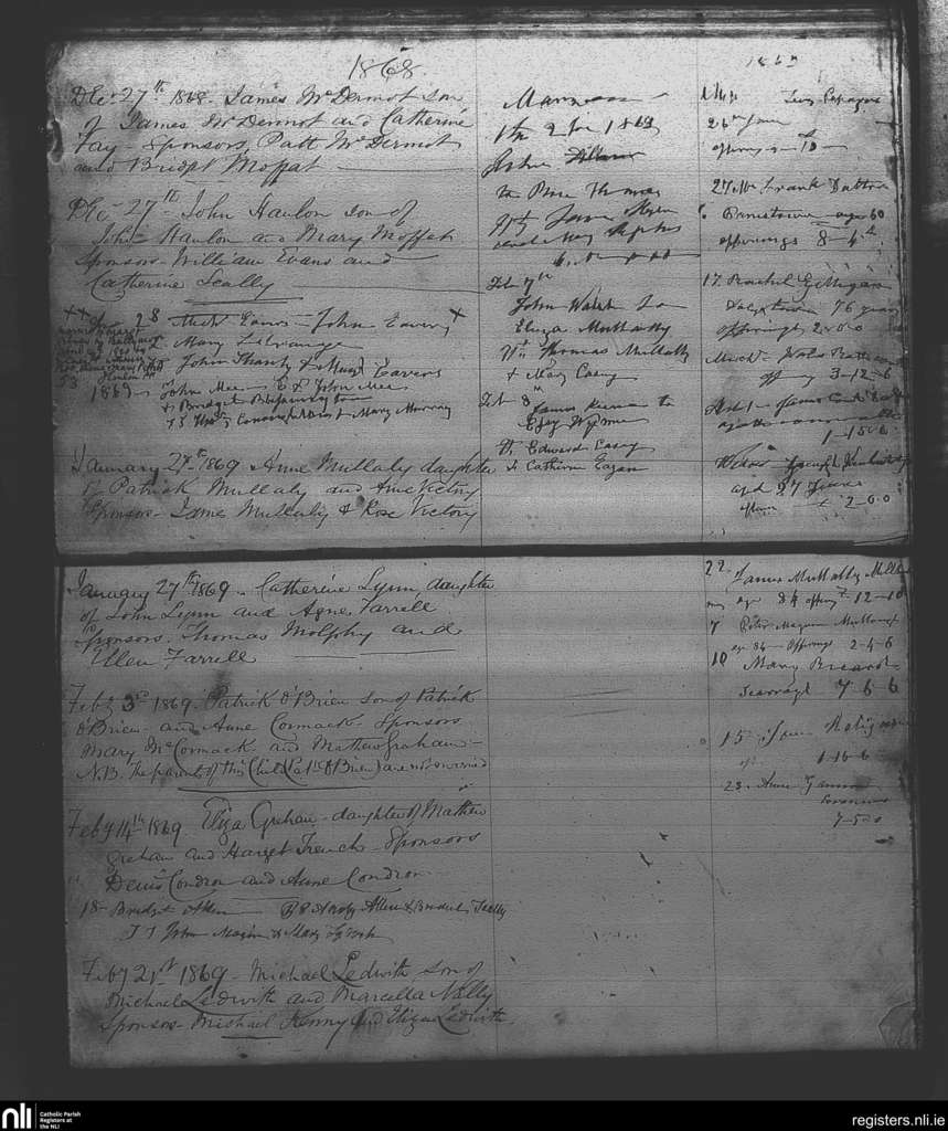 Milltown; County of Westmeath; Diocese of Meath. Baptisms, Marriages, Deaths, Dec. 1868 to Mar. 1869