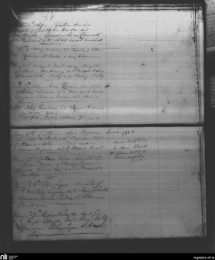 Milltown; County of Westmeath; Diocese of Meath. Baptisms, Marriages, Apr. 1869 to June 1869