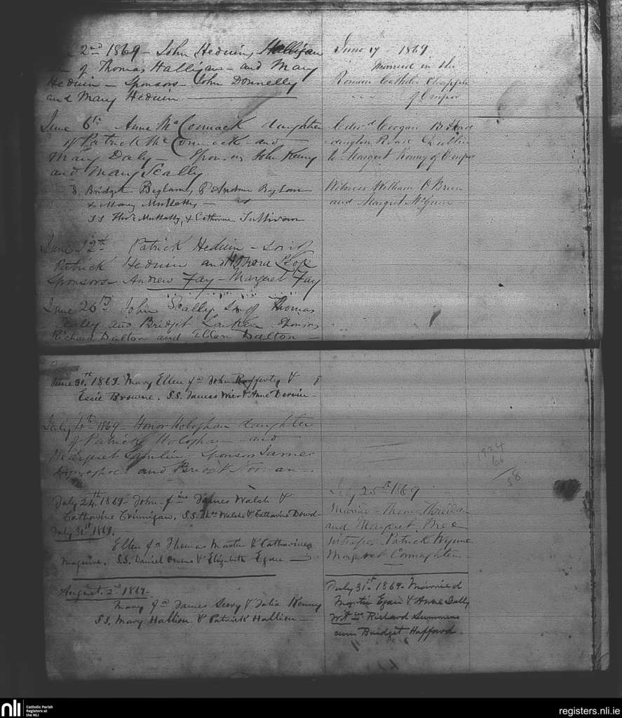 Milltown; County of Westmeath; Diocese of Meath. Baptisms, Marriages, June 1869 to Aug. 1869