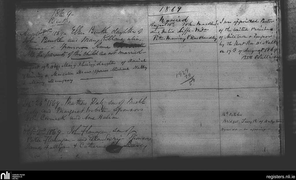 Milltown; County of Westmeath; Diocese of Meath. Baptisms, Marriages, Deaths, Aug. 1869 to Oct. 1869