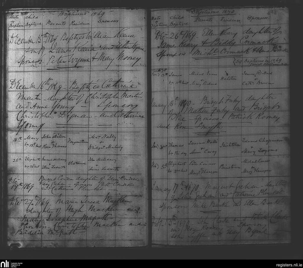 Milltown; County of Westmeath; Diocese of Meath. Baptisms, Dec. 1869 to Feb. 1870