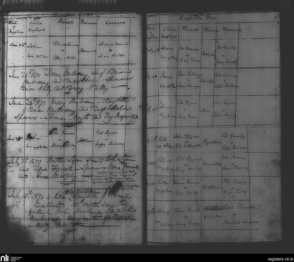 Milltown; County of Westmeath; Diocese of Meath. Baptisms, June 1870 to July 1870
