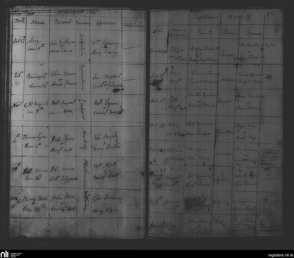Milltown; County of Westmeath; Diocese of Meath. Baptisms, Oct. 1870 to Jan. 1871