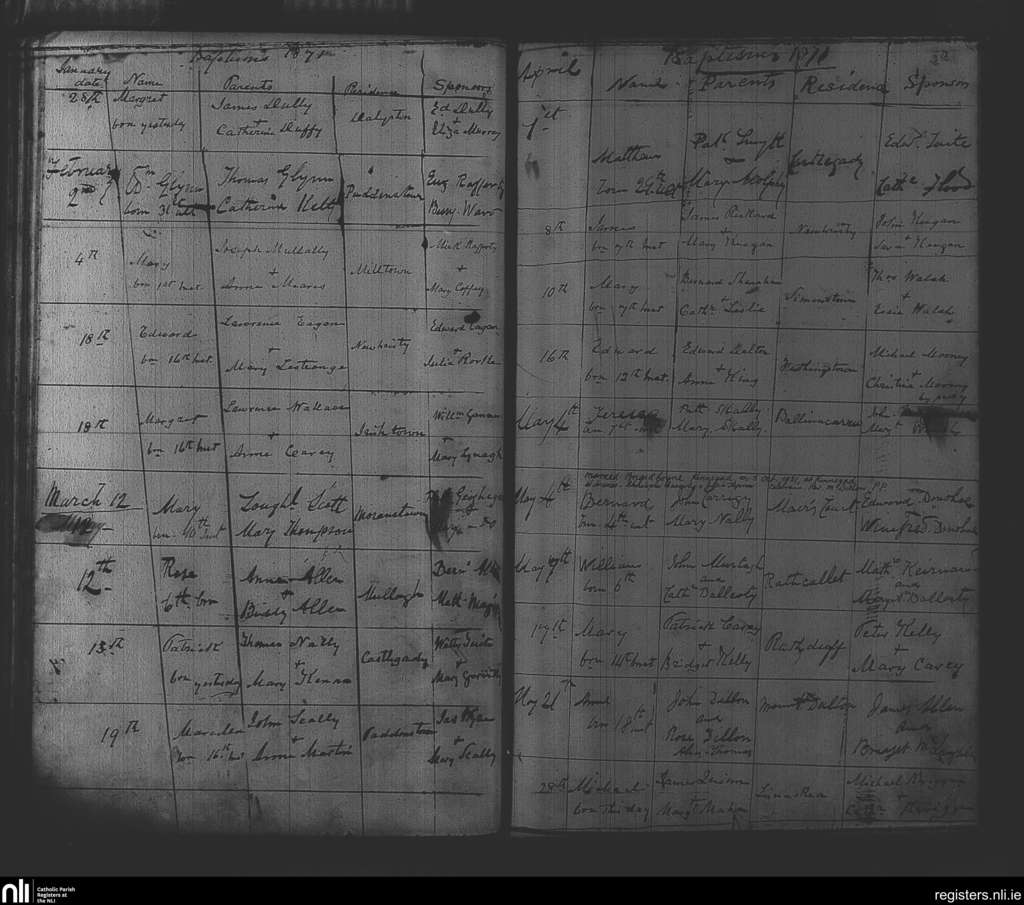 Milltown; County of Westmeath; Diocese of Meath. Baptisms, Jan. 1871 to May 1871