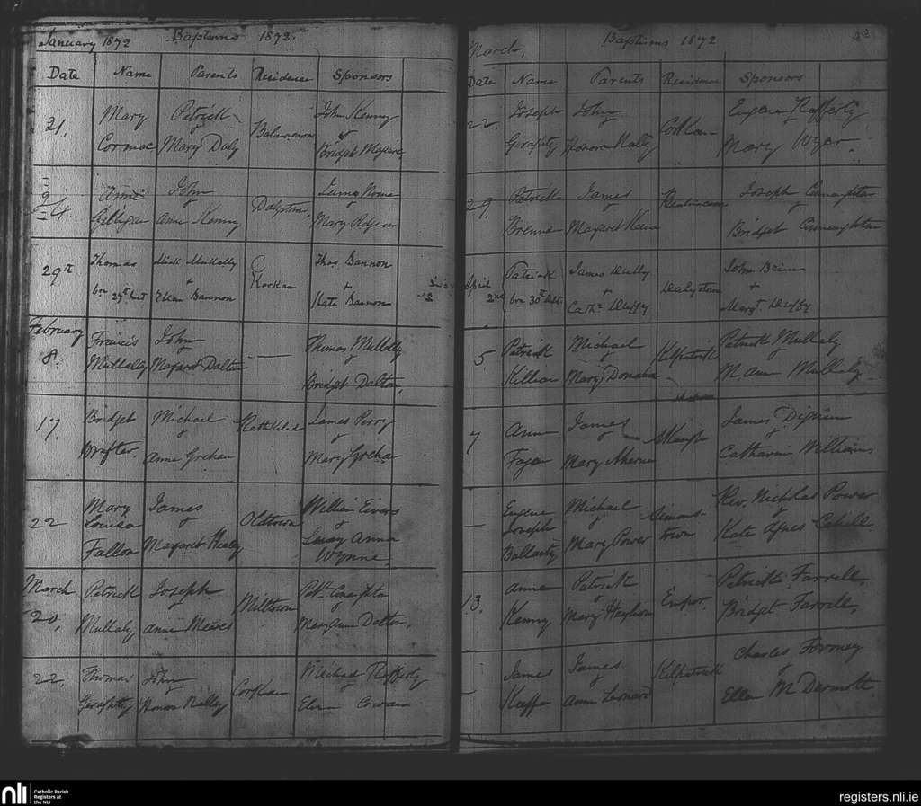 Milltown; County of Westmeath; Diocese of Meath. Baptisms, Jan. 1872 to Apr. 1872