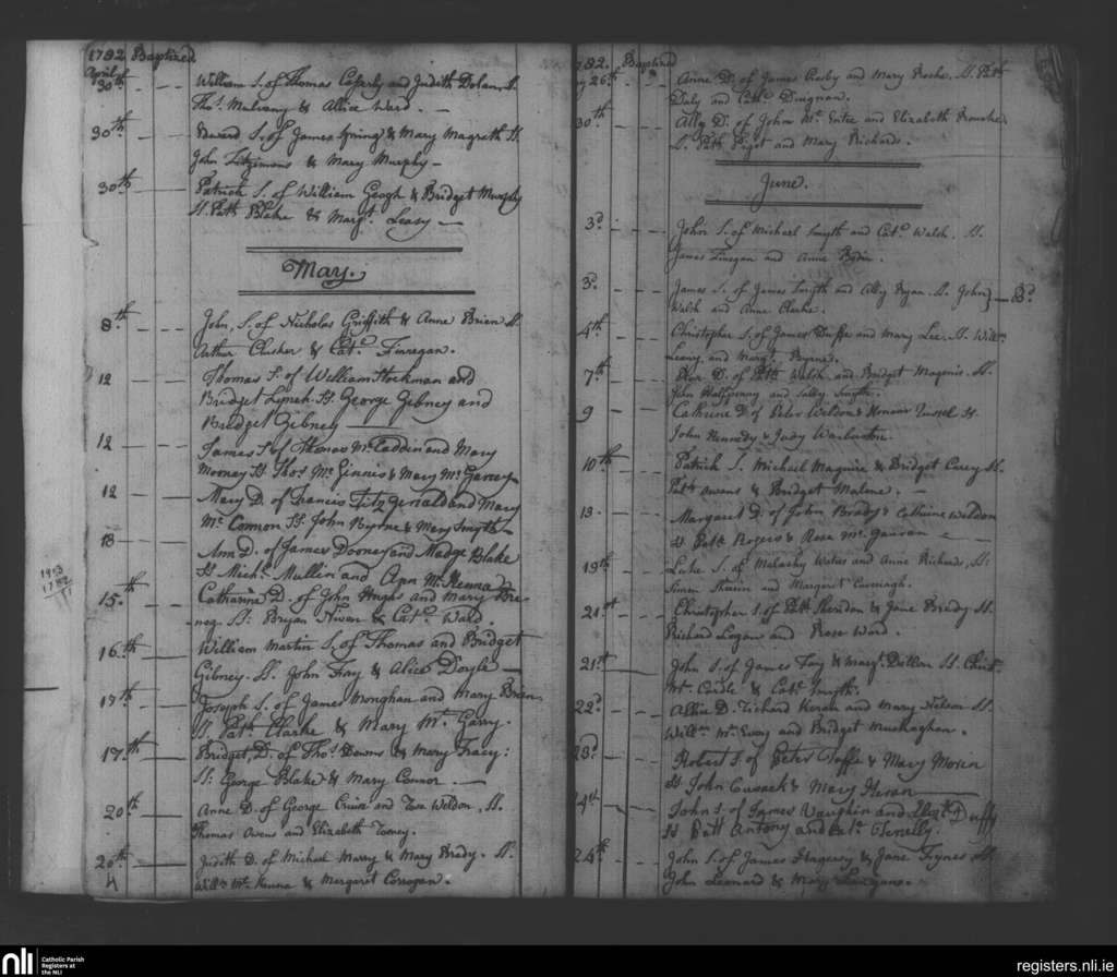 Navan; County of Meath; Diocese of Meath. Baptisms, Apr. 1782 to June 1782