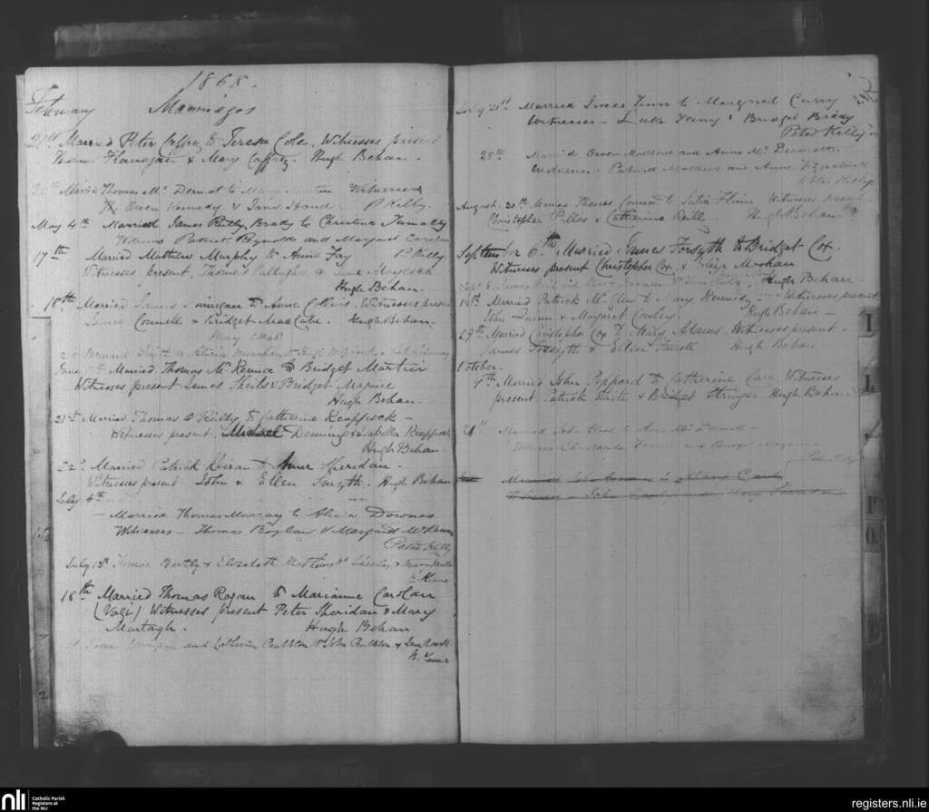 Navan; County of Meath; Diocese of Meath. Marriages, Feb. 1868 to Oct. 1868