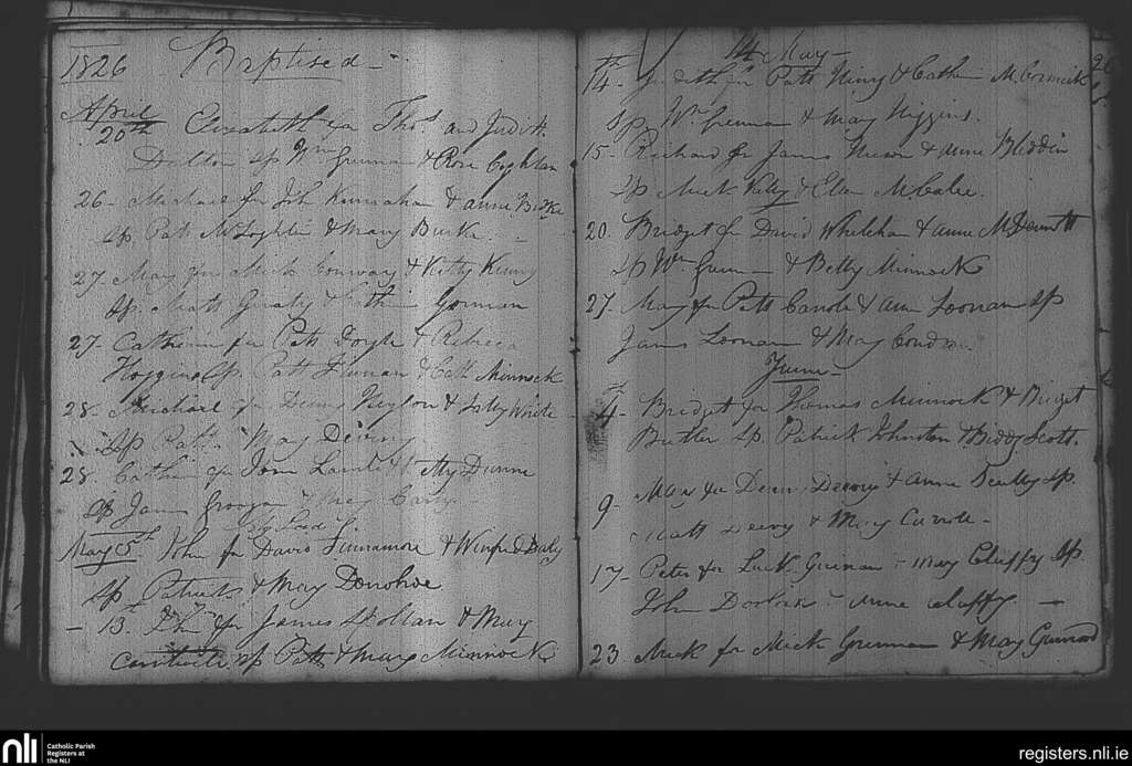 Rahan and Lynally; County of Offaly; Diocese of Meath. Baptisms, Apr. 1826 to June 1826