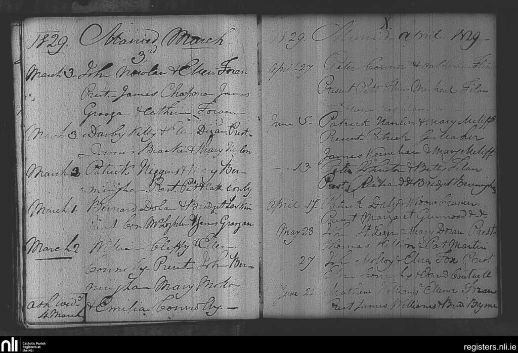 Rahan and Lynally; County of Offaly; Diocese of Meath. Marriages, Mar. 1829 to June 1829