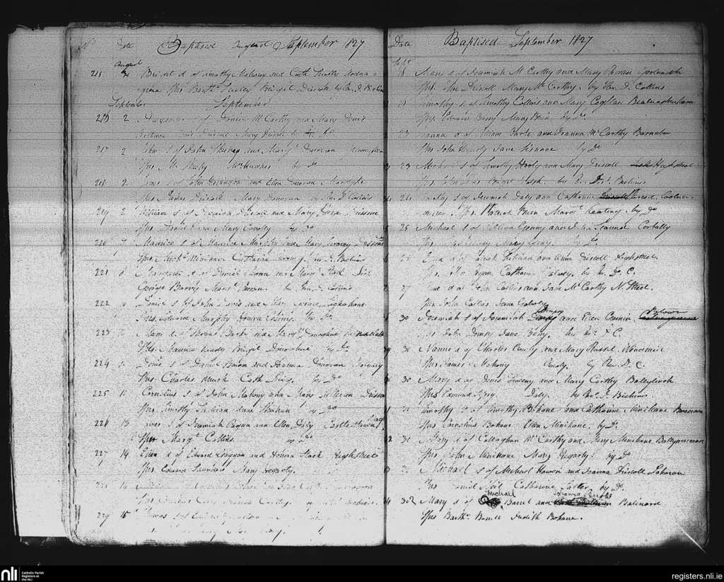 Skibbereen; County of Cork; Diocese of Cork and Ross. Baptisms, Aug. 1827 to Sep. 1827