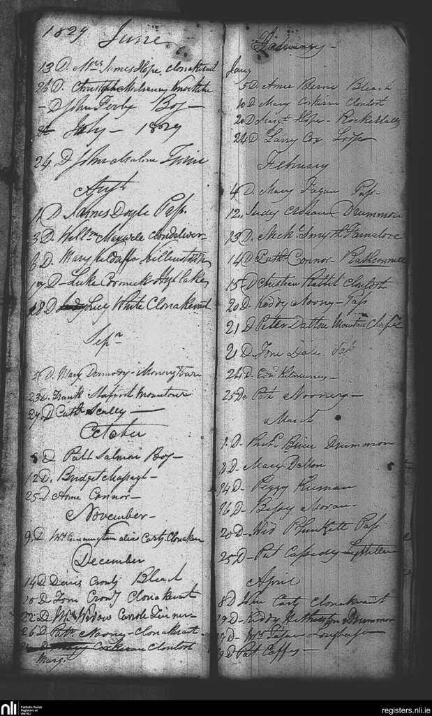 Taghmon; County of Westmeath; Diocese of Meath. Deaths, June 1829 to Apr. 1830