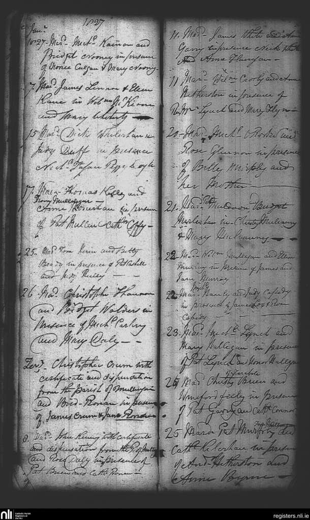Taghmon; County of Westmeath; Diocese of Meath. Marriages, Jan. 1827 to Feb. 1827
