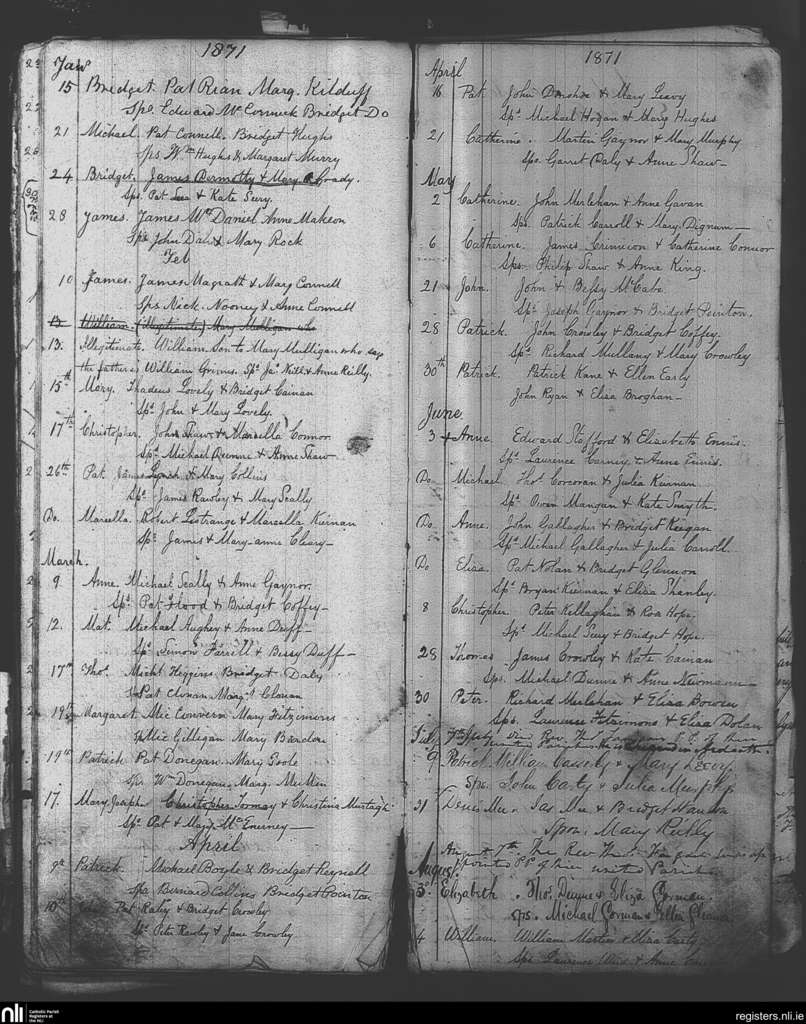 Taghmon; County of Westmeath; Diocese of Meath. Baptisms, Jan. 1871 to Aug. 1871