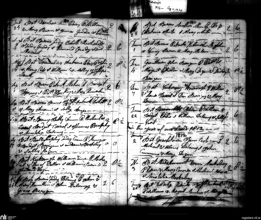 Aghaboe; County of Laois; Diocese of Ossory. Baptisms, July 1811 to Jan. 1812