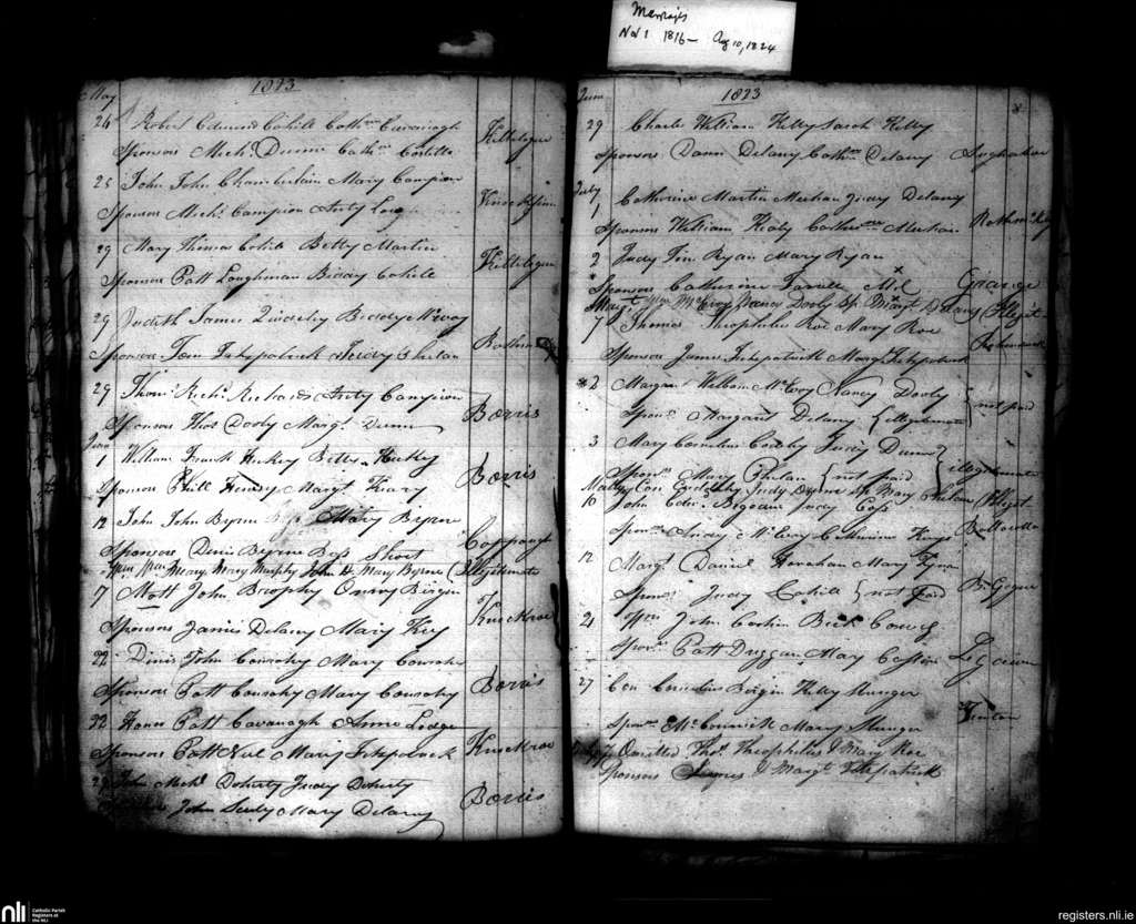 Aghaboe; County of Laois; Diocese of Ossory. Baptisms, May 1823 to Aug. 1823