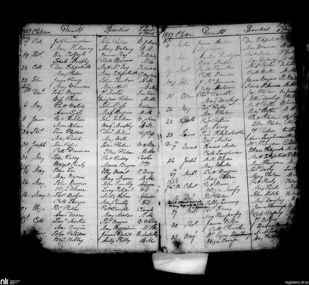Aghaboe; County of Laois; Diocese of Ossory. Baptisms, July 1857 to Jan. 1858