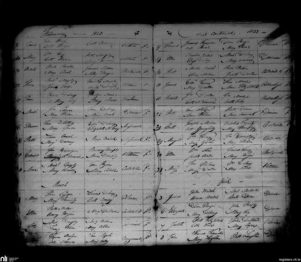 Durrow; County of Kilkenny, Laois; Diocese of Ossory. Baptisms, Feb. 1823 to Apr. 1823