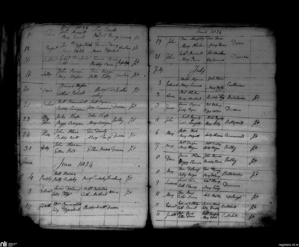 Durrow; County of Kilkenny, Laois; Diocese of Ossory. Baptisms, May 1824 to July 1824