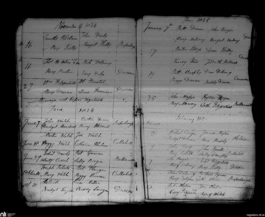 Durrow; County of Kilkenny, Laois; Diocese of Ossory. Marriages, June 1824 to Feb. 1825