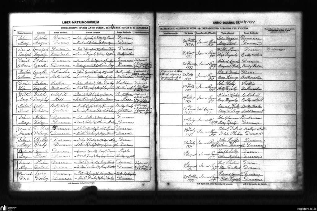 Durrow; County of Kilkenny, Laois; Diocese of Ossory. Marriages, Oct. 1870 to Oct. 1871