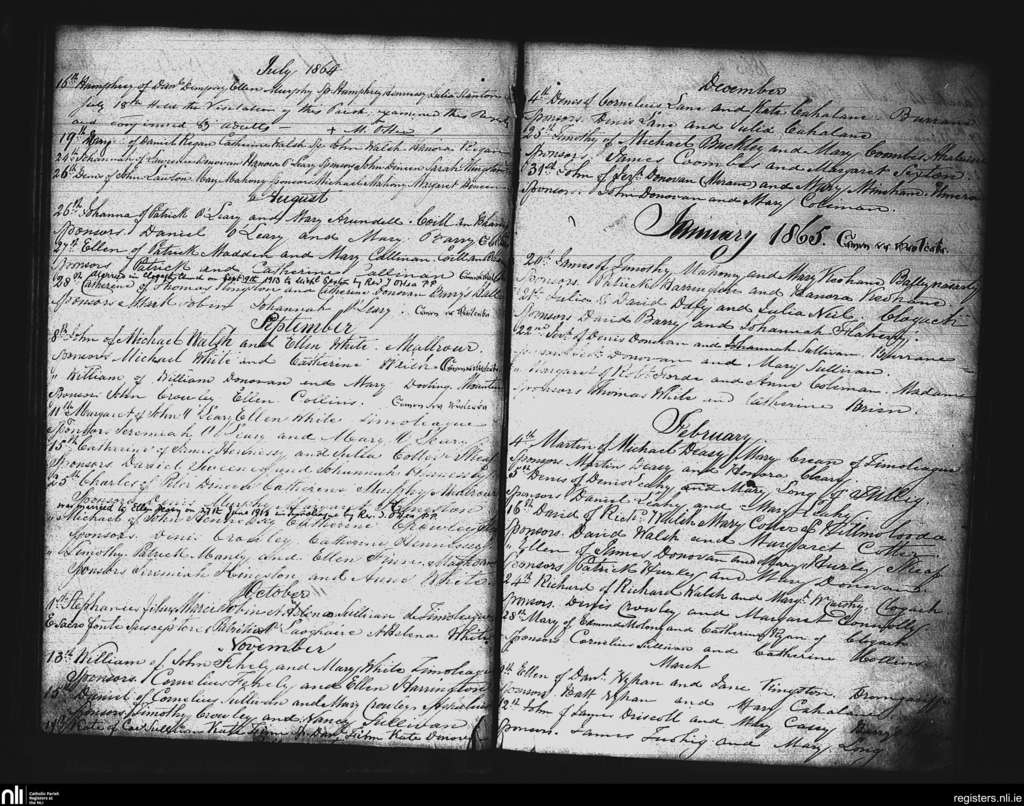 Timoleague; County of Cork; Diocese of Cork and Ross. Baptisms, July 1864 to Mar. 1865