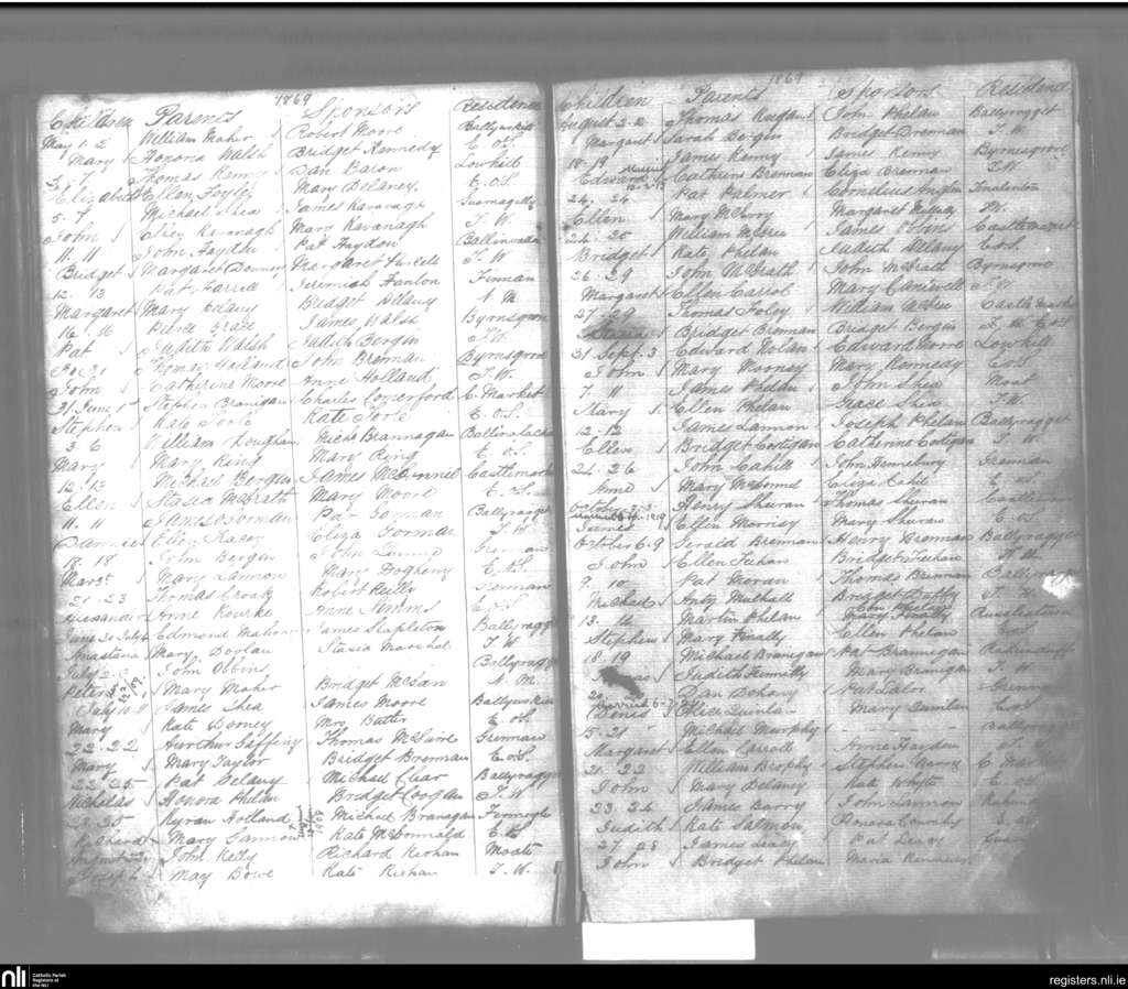 Ballyragget; County of Laois, Kilkenny; Diocese of Ossory. Baptisms, May 1869 to Oct. 1869