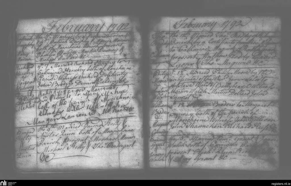Carrigeen and Mooncoin; County of Kilkenny; Diocese of Ossory. Marriages, Feb. 1792
