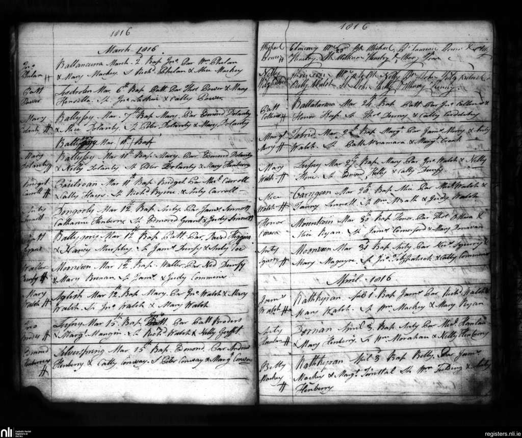 Carrigeen and Mooncoin; County of Kilkenny; Diocese of Ossory. Baptisms, Mar. 1816 to Apr. 1816
